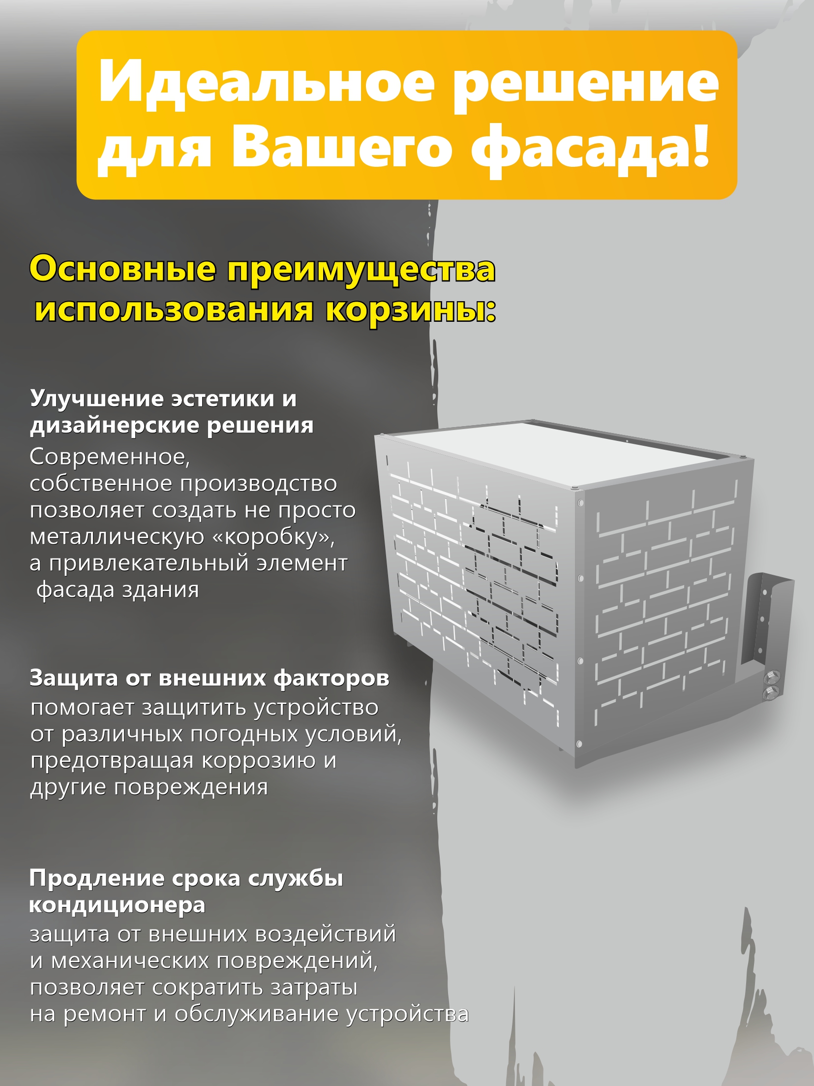 Компания Сигнал предлагает к продаже корзины для кондиционера в комплекте с кронштейном из двух частей, вы также можете выбрать другой вариант кронштейна на ваш выбор, в таком случае цена будет отличаться, уточняйте у менеджеров